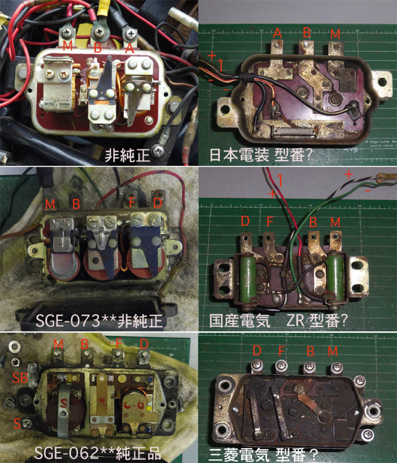 画像の下段はレギュレータの裏表画像で、 手元に3個のレギュレータがあります。 最下段が当時から付いていたもの。 中段はSGE-073**に付いていた頂き物。 最上段は1983年頃に電装屋さんから新品で購入したもの。