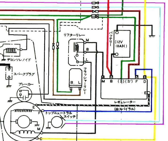 画像は上部がダイナモとレギュレータの結線で、light類をFに接続とどこかで見ました。 現在の配線は、Light類はF端子はゼロボルトの範囲が 高回転までなのでB端子に直接配線しています。 細かい説明文は自分用に書き留めたものですので無視してください。
